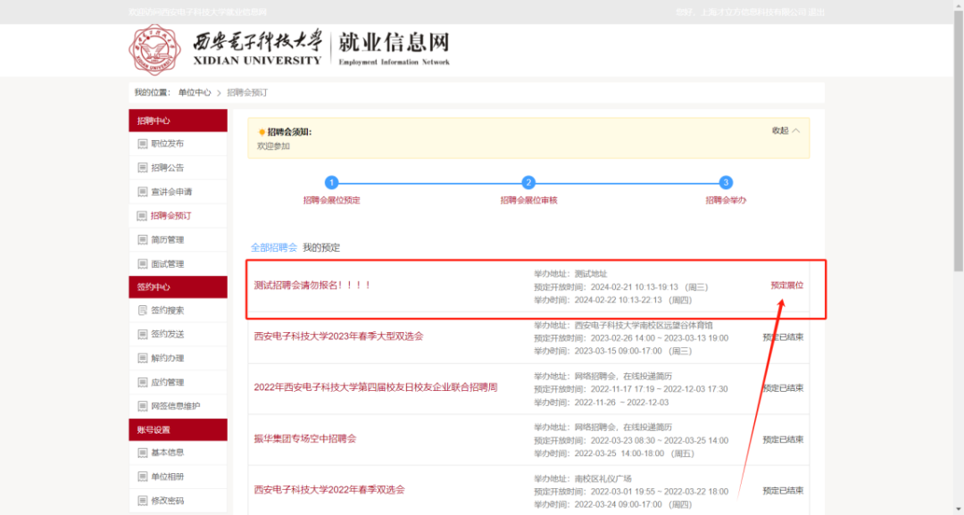 用人单位进入单位中心后点击【招聘会预定】按钮即可查看双选会。如下图: